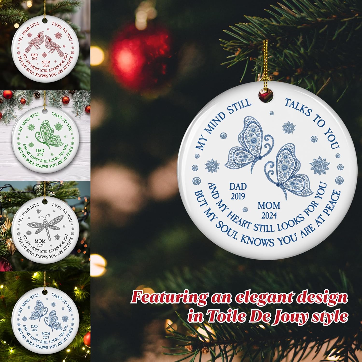 Personalized Memorial Christmas Ornament Toile De Jouy Style - My Mind Still Talks to You, Custom Name Remembrance Ceramic Ornament for Loss of Loved Ones, Sympathy Gifts for Deceased